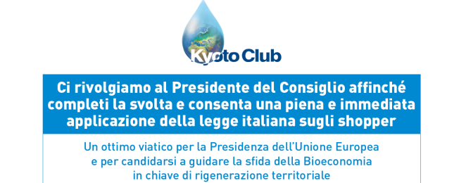 Europrogetti aderisce al manifesto del Kyoto Club sui bioshopper per la piena e completa sostenibilità ambientale dei nostri modelli di vita e per la chiusura di un’era: quella dei sacchetti in plastica usa e getta. L’appello chiede al Presidente del Consiglio di dare piena attuazione al divieto di commercializzazione degli shopper monouso che non siano biodegradabili e compostabili conformemente allo standard europeo EN 13432! Per la sottoscrizione www.kyotoclub.org